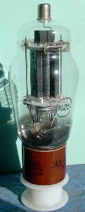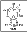 A famous beam power tube was the type 807, a graceful large tube with an ST envelope and a plate cap, shown in the photograph at the right. It appeared with a 12.6V heater as the type 1625, known in military service as the VT-136 and used in many military radio sets as an RF power amplifier. These days, it is considerably cheaper than the 807. With 30W plate dissipation, the 807 or 1625 could deliver well over 100W RF power when used in push-pull, operating at full ratings up to 60 MHz. These tubes also could handle heavy-duty audio amplification. The basing of the 1625 is shown below on the left. For some reason, it used a rare 7-pin base instead of the standard 5-pin base of the 807. The internal construction can be glimpsed at the bottom of the plate, and the beam-forming electrodes, as well as the aligned grid wires, can be seen. It is noted in specifications that the plate did not glow when the tube was used within its amateur (ICAS) or commercial (CCS) ratings. If a plate gets hotter than when it was outgassed at the evacuation of the tube, it may emit gases and ruin the tube.