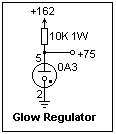 Another kind of tube that we'll look at here is the glow-tube voltage regulator. The voltage across a glow discharge depends on the gas and the cathode material, and is almost idependent of the current through the discharge in the "normal glow" region, in which the glow does not completely cover the cathode, and expands to accommodate more current. Tubes were manufactured for voltages of 75, 90, 105 and 150 that were used like Zener diodes, handling from 5 to 40 mA. There is more information on glow discharges in Relaxation Oscillators, and on Zeners in Voltage Regulators. VR tubes are treated here because of their association with vacuum tubes, and the higher voltages involved.