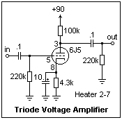 Several circuits using the 6C5 are shown at the right. All of these functioned very well, and are excellent examples. At the left is a normal voltage amplifier, as suggested in the RCA tube handbook. The grid bias was 4.5V, the plate potential 98V, and the gain was -15. The gain was closely predicted by the load of 47k||11k and the transconductance of 1.8 mS. The plate current was 1.67 mA. As usual, small plate currents are used in voltage amplifiers so that the plate resistor can be as large as possible.