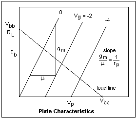 Let's begin with idealized plate characteristics for a triode, shown at the right. These are curved lines, but we represent them by straight lines for ease of understanding the various slopes and distances involved, which will be constant. Actual characteristics are not really far from straight lines, anyway. There is one curve for each grid voltage represented, which differ by a constant amount, here 2V. The horizontal distance between them, represented by the line labelled μ, is the amount the plate voltage must increase to hold the plate current constant; it represents the relative influence of plate and grid on plate current, and is the amplification factor. The vertical distance between them shows how much the plate current changes for a change in grid voltage. The ratio is a conductance, called the transconductance, denoted by gm, measured in siemens (mho). The slope of the curves is the ratio gm/μ, called the plate conductance gp. With vacuum tubes, the reciprocal rp was always used, called the plate resistance. Since actual characteristics are curved, these quantities vary for different currents and voltages.