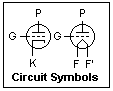 Circuit symbols for a triode are shown at the right, and other tube symbols are derived from it. The connections are plate P, grid G, and cathode K or filament F, F'. These are analogous to the collector, base and emitter of a transistor, with the same polarities and direction of current flow as an NPN transistor. The circle is a part of the symbol. Grid connections can be to the right or left of the symbol, as convenient. A gas tube is indicated by a dot in the lower right-hand part of the circle. The heater of an indirectly heated cathode is usually not shown. A cold cathode (operating by positive-ion bombardment) is shown as a small circle. There are examples of these symbols below.