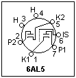 The 6AL5 dual diode, whose basing is shown at the right (7-pin miniature socket), is a typical signal diode. IS is an internal shield between the diodes. The two diodes and the shield are easily seen through the glass envelope, and you should notice how close the plates are to the cathodes. The close spacing means a large perveance, so only small plate voltages are required. Don't connect this tube directly across high voltages! A peak inverse voltage of 330 V can be resisted, and the DC plate current should not exceed 9 mA. Peak currents can go up to 45 mA if necessary, however. I measured the perveance as 2.42 mA/V1.5, for one plate, a large value. The 6AL5 gives 9 mA with a plate voltage of only about 2.5 V! The heater, connected to H-H, pins 3 and 4, takes 0.3 A at 6.3 V.