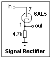 Try the 6AL5 in the circuit shown at the left, which is a basic signal rectifier with a 4.7k load resistor. Feed it with the signal generator, and compare the output and input with the oscilloscope. Try input peak-to-peak voltages of only 2 V or so. You will notice that there is no "diode drop" with the 6AL5--it acts like a perfect diode, rectifying down to small voltages. We know how to do this with a semiconductor diode and an op-amp, but here it's done quite simply. The 6AL5 has an incremental resistance of only about 237 Ω, and is nearly linear. It is easy to run a plate voltage versus plate current curve with a low-voltage power supply. Keep the load resistor, and subtract the voltages at plate and cathode to find the plate voltage.