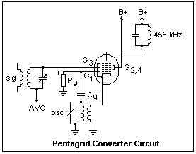 A typical pentagrid converter circuit is shown at the right. This circuit is for illustration, and is not a suggested laboratory exercise. The grids are numbered from 1 to 5, starting at the cathode. Typical pentagrid converters were the 6SA7, 6BE6 and the 1R5, the latter for low-voltage battery receivers. The earliest pentagrid converters, like the 6A8, were slightly different. Instead of the suppressor grid G5 of the 6BE6, the 6A8 made it grid G2. The cathode, G1 and G2 corresponded to the cathode, control grid and plate of a triode, which served as the oscillator. The modulated electron beam then passed on through G3 and G5, between which was the control grid G4, to the plate. G2 was found unnecessary, and was moved to become a suppressor grid, internally connected to the cathode as in a pentode. G1 remained the oscillator grid, but the oscillator plate was represented by the ensemble of G2, G4 and the plate. G2 and G4 are connected internally and screen G3 very tightly.
