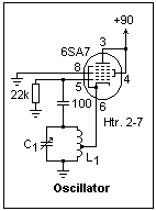 Check the DC resistance between the the terminals to be sure of this. My coil was advertised to be 225 μH. The oscillator is a Hartley. Capacitor C1 is a variable capacitor. Mine was an old-style single gang air capacitor that varied from 11 pF to 372 pF, as measured by DMM. Stray capacitance is a problem both in measuring small capacitances and in determining the value used to calculate the resonant frequency. If you do not have such a capacitor (they are now hard to find), simply use a fixed capacitor, such as a ceramic, of suitable size. The plate voltage is not critical. The grid bias when operating was -2.5 V. The purpose of the oscillator is to produce a modulated electron beam in the tube.