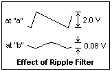 The RC ripple filter is worth the expense. Waveforms are shown at the left. The waveform at node "a" is the familiar one for a "tank" capacitor, and the ripple is fairly large. Since the impedance of a 100 μF capacitor is only 26Ω at 60 Hz, the ripple is reduced by a factor of almost 25. At 300V output and a load of 12 mA, the ripple is less than 0.1V, a very satisfactory result. Note that all that is left in the ripple is the 60 Hz component. The filter would work even better on a full-wave rectifier, but here it is very satisfactory, better and more economical than larger capacitors. Of course, a filter choke could be used for an even better result and less voltage drop, but this would double the cost of the supply.