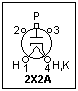 The 6J6 is also a very interesting tube. As with the 6AN4, the "works" can easily be seen. A cross-section of the 6J6 is shown at the right. There is a separate plate and grid on each side of the wide cathode, making two triodes that share a common cathode. The two triodes have an almost planar geometry, which is unusual. This tube was used as a UHF oscillator, to above 420 MHz, and as a computer tube as well. Its simple and symmetrical design made it useful at high frequencies. The maximum plate voltage is 300 V, and each plate can dissipate 1.5 W. Because of the large cathode surface, the transconductance is a high 5.3 mS under typical conditions. If the plates and grids are connected together the result is a triode with a transconductance over 10 mS. The basing of the 6J6 is shown at the left.
