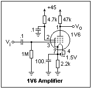 Unfortunately, I do not have any actual circuits that used a 1V6, but the amplifier shown at the left may be studied. It gave a gain of -14 with a plate current of 357 μA, so the effective transconductance was 298 μS. I substituted a 100k plate resistor, but the gain only increased marginally, to about -17. By experimenting, you may be able to get more gain from the tube. At low plate currents, the amplifier oscillated in an odd manner, and there were other peculiarities seen while fiddling around, but I did not take the time to track them down.