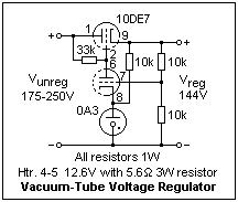 Use a VR tube as a Zener to regulate voltage. I used a 0A3 or VR75 in the diagram at the left, which needs a supply of at least 105 V (so it will strike when turned on), and is in the normal glow region from 5 to 40 mA current. I used a "raw" 161 V supply, and a 10k resistor because I had a 1W one handy. This resistor should be sized to pass the full current required, up to 40 mA in a practical case. There is a jumper between pins 3 and 7 to put in the heater leads to the rectifier tube so that the supply cannot be started up with the VR tube removed. VR tubes are not quite as good as Zeners for voltage constancy. Once they decide on a voltage, it will be constant, but exactly what voltage that will be is uncertain. Like Zeners, VR tubes were used as a voltage reference in regulated power supplies. The OA3 has an orange-yellow glow (Ne); at this current level, it is easy to see that the glow does not cover the complete cathode, which is the tubular metal part. The anode is merely a central wire. My 0A3 gave 72.8 V when first turned on, and a steady 72.5 V after burn-in of about 30 minutes. These tubes make a very convenient regulated supply for experiments. Besides the 0A3, there are the 0B3 (90 V, violet glow, Ar?), 0C3 (105 V, blue glow, Xe), and 0D3 (150 V, pink glow, Kr), all with the same basing. The OD3 struck on the laboratory power supply described above, but not much current could be supplied with the resistor used.