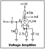 The 1LH4 is a loktal battery triode, which is shown in a voltage amplifier at the left. A similar octal tube is the 1H5-GT, and either will do in this experiment (but the basing is different!). A diode plate is included, connected to pin 4, and using the negative side of the filament as its cathode. The diode is not used in this circuit. The maximum plate voltage is 110V, but this can be exceeded a little in testing. I measured the characteristics for plate voltages of 125V and less, at grid voltages of 0.0, -0.5 and -1.0V (relative to the negative end of the filament). The plate current was always less than 1 mA. My results were μ = 62, gm = 340 μS, and rp = 182kΩ. These values are close to the published values. The characteristics are noticeably curved in this region, so the parameters will vary with plate current. The apparently low value of transconductance is quite reasonable for the small plate currents at which the tube is used.