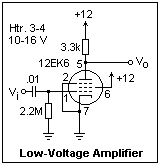 The 12EK6 (also known as 12DZ6 and 12EA6) is a screen-grid pentode for low-voltage use. A voltage amplifier using this tube is shown at the left. This tube was generally used as an IF or RF amplifier, so the load would have been a resonant circuit, not a resistor, giving much higher gain. However, the resistive load is easy to experiment with. There is no voltage to waste for cathode bias, so grid-leak bias is used. When a signal is applied, the bias will adjust itself so that the top of the input waveform is clamped to 0 V. Vary the input amplitude to verify this. This circuit works with an input of up to about 2 V peak-to-peak, perhaps best for an input of around 1.0 V p-p. The output voltage is then about 5.8 V p-p, the plate potential is 6.0 V, plate current 1.8 mA, and gain about -5.5, corresponding to a transconductance of 1.8 mS, about right from measurements of the characteristics and the position of the operating point in this case. The transfer characteristic is rather curved, leading to considerable distortion for larger amplitudes. Nevertheless, it is remarkable that the circuit works so well at such a low voltage.