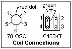 The oscillator coil, available from Antique Electronics as their 70-OSC, is a universal type of coil that can be used in a variety of circuits. Terminal 2 is a tap on main winding 1-3 (closer to 3 than 1) that can be used with a Hartley oscillator, while winding 3-4 is available for feedback. It can be tuned by moving a slug inside. When resonated with my 365-10 pF variable capacitor, it covered the range 520-1460 kHz. I coupled the resonant circuit to the grid with a 100 pF capacitor, with feedback from the plate. There are two ways to phase the coil, and the one I initially chose was wrong, so I reversed terminals 4 and 5, and the circuit oscillated well. The load for the hexode was a 455-kHz IF transformer, denoted C455KT. The connections for these transformers are shown in the figure. Knowing the connections makes things much easier. They should be checked with the DMM if the coil is unfamiliar, to make sure the connections have been properly identified. There seems to be little uniformity in connections.