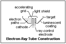 The construction of an electron-ray tube is shown in cross-section at the right. The target is a part of a cone of an angle of about 100°, 22 mm in diameter at the top, 8 mm in diameter at the bottom, and 5 mm high. A cathodoluminescent coating on the inside of the target creates an annular ring of greenish light about 6 mm in projected width around the 9 mm diameter light shield. The cylindrical cathode thimble is at the center, with heater inside, and is surrounded by a helical accelerating grid that acts just like the screen grid of a tetrode to create the target current of a few milliamperes. At one side is a ray-control electrode, a flat metal strip insulated from the other components. The electrons are accelerated from the space charge region by the accelerating electrode, and then pass into a nearly field-free region where they drift in straight lines to the target, creating light when they strike the phosphor.