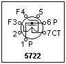 An available noise diode is the 5722, whose basing is shown at the right. The 7-pin miniature tube was made as late as 1977, and now costs about $14, which is probably not much more than when it was new. The maximum plate voltage is given as 200 V, and the maximum plate current as 35 mA, so apparently the plate can dissipate 7 W. The plate has wings that make a good dissipation probable.
