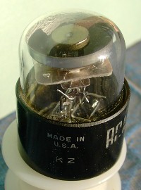 A very curious and ingenious kind of tube was the electron-ray tube, used on receivers to give a visual indication of the accuracy of tuning to a station. Don't confuse it with the cathode-ray tube that uses a guided electron beam for oscilloscopes and TV receivers. It showed a luminous disk, with a dark sector. The dark sector was made as small as possible to achieve accurate tuning. It worked from the AGC (automatic gain control) voltage of the receiver. This is a feedback signal that tries to keep the signal amplitude constant at the output of the intermediate frequency amplifiers, increasing the gain for weak signals and decreasing it for strong. It is usually a negative voltage produced by rectifying the IF output. The tube has a thermionic cathode and a conical anode or target covered with cathodoluminescent phosphor (like a CRT), which glows from the 3 or 4 mA of plate current that flows when it is across 125V or more (up to 250). Control electrodes, of which there are two on opposite sides of the 6AF6, make two dark sectors that are widest when at 0V, and narrow as the control voltage approaches the target voltage. The control voltage is typically provided by the plate of a triode controlled by the AVC, such that full negative AVC cuts off the triode and makes the sector as small as possible. All this was cheaper and more graphic than a pointer meter.