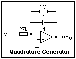 If two-phase is necessary, the circuit at the left provides a signal leading the input by 90°. It is, of course, just an integrator with transfer function 1/jωCR. The phase shift does not depend on the frequency, but the ratio of the ouput and input amplitudes does. This circuit is designed to give equal amplitudes for 60 Hz. The 1M resistor is added so that the ouput will not drift if there is a small DC component in the input, perhaps from leakage. When the phase shifter is turned on, you may see a small notch in the ouput that will gradually disappear. The DC gain of the circuit is 37. Observe the relation of input and output using a Lissajous figure. It ought to produce a circle in an XY display. Vary the frequency to see what happens. The circle becomes an ellipse, but its axes remain vertical and horizontal, showing that the phase shift is constant at 90°.
