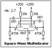A practical multivibrator circuit is shown at the right. The 6N7 dual triode is probably not ideal for this service, but I chose it because it is a rugged tube, and I expected to make mistakes. The 6SN7 or 12AU7 dual triodes were classically used for multivibrators, and they would work well here as well. This circuit, in which R1 << R2, gives the characteristic square-wave output at the plates, with a sharp negative spike at the leading edge of the negative phase. When, on the other hand, R1 >> R2, the waveform at the plates is a series of decreasing and increasing exponential ramps of large amplitude.