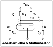 The circuit of the Abraham-Bloch multivibrateur, so-called because its output is rich in harmonics, is shown at the right. It is also called a plate-coupled multivibrator. The tube shown is a dual triode with common cathode, but a tube with independent cathodes, or two separate tubes could be used. Each triode forms an inverting amplifier capacitor-coupled to the other. The overall gain is -1 x -1 = +1, so the circuit is unstable and will oscillate. Instead of a sinusoidal oscillation at some high frequency, relaxation oscillations will result, since the gain is unity at all frequencies down to zero. The circuit is called an astable, since neither of its internal states persists indefinitely. The wave form depends on the ratio R1/R2, its amplitude on R1, and its frequency on the values of C and R2 (mainly). The plate current is the current that results for zero grid bias with the given plate supply voltage.