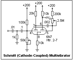 The circuit at the right is a multivibrator of the type invented by O. E. Schmitt [Jour. Sci. Instr., 15, 24-26 (1938)], also called a cathode-coupled multivibrator. The coupling to the right-hand triode is through a capacitor, as in the Abraham-Bloch circuit, except that the grid is pulled up to Ebb through a large resistance, so that this triode is normally on. Coupling to the left-hand triode is through the cathode resistor. The normal plate current of about 5 mA puts the cathodes at about 50 V. The grid of the left-hand triode is held at a voltage depending on the adjustment of the 50k pot. Initially, adjust this pot to maximum. When the grid bias is sufficiently high, both tubes conduct, and this is an unstable state. If the right-hand triode conducts a little less, the voltage across the cathode resistor decreases, causing the left-hand tube to conduct more, and the plate voltage drops, which drives the grid of the right-hand tube more negative. This produces State 2, where the left-hand tube is conducting and the right-hand tube is cut off.