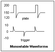 Waveforms for the triggered monostable are shown at the left. The grid bias was set at 43.5 V. A square wave from the signal generator was connected to the RC differentiating circuit to produce trigger pulses as shown in the figure. A peak of 9 V appeared to give reliable triggering. Note that the negative-going pulse is ineffective, since it only makes a cutoff bias even greater. The trigger frequency can be varied over a very wide range while the pulses remain the same length, which is roughly the same as for the astable case. Triggering is essentially different than synchronization. It is asynchronous, an output pulse occurring whenever the trigger pulse arrives. The trigger is not active during the output pulse, so this monostable is not retriggerable.