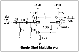 Another single-shot is shown at the right. The tube used is the 14AF7 loktal dual medium-mu triode. The more expensive 7AF7, the 6SN7, or any similar dual triode can be used. In the normal state, V2 should be on (the grid-cathode potential near zero), and the voltage developed across the 4.7k cathode resistor should be sufficient to cut off V1. In this circuit, the plate current of a bit over 3 mA makes this voltage 15V. Therefore, the plate of V1 is near 120V, and the timing capacitor C is charged. Originally, I tried a cathode resistor of 2.0k, and this was not enough to cut off V1. The plate resistor for V1 must be large enough to saturate the plate when V1 is triggered on. This pulls the grid of V2 well below cutoff, and gives the rising edge of the output pulse.