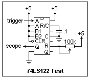 The 74LS122 is a Retriggerable Monostable Multivibrator, or "single-shot," that can be used to make pulses of a wide range of widths. The 74LS123 has two such single-shots in a single package. Complementary outputs Q and /Q are provided, so positive and negative pulses are easily available. The circuit is triggered on the high-to-low transition of the trigger input, upon which Q goes low and /Q goes high. The pulse width, tw, is controlled by an RC time constant: tw = 0.45 RC, approximately. The 74LS122 contains an internal 11k resistance that can be used for R, or an external resistor between 5k and 180k can be used. The timing capacitor C is best when 1 nF or greater (so stray capacitances do not have a large effect), and is chosen for the range of pulse widths desired. For C = .001 (1 nF) the pulse width using the built-in resistance is about 4 μs; for C = .01, 40 μs; for C = 0.1, 0.4 ms, and so on. A 50k or 100k rheostat in addition to the internal resistance allows the period to be increased up to a factor of 5 to 10 in each case, so the whole range 4 μs - 4 ms is covered with capacitors from .001 to 1.0 μF. The circuit works quite well and stably in this range.