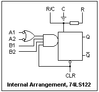 The internal arrangement of the LS122 is shown at the left. To trigger, either A1 or A2 must go low, B1 and B2 must both be high, and CLR must not be activated. This permits many variations of trigger inputs. The CLR immediately terminates the output pulse when it is pulled low, and inhibits further triggering. If the single-shot is triggered during a pulse, the pulse is lengthened for its full amount beyond the trigger. If the circuit is continuously retriggered before the end of the pulse, the output remains low constantly. This feature can be used as a "watchdog," for as long as retriggering pulses arrive quickly enough, the output remains low. A high output (timed out) will show that triggers have not arrived as expected. The diagram also shows the connections for the timing R and C. The C pin is connected internally to ground, but it is best to ground it externally as well. R/C can be connected to +5 through an external timing resistor if desired, or the R pin can be connected directly to +5 to use the internal timing resistor (11k).