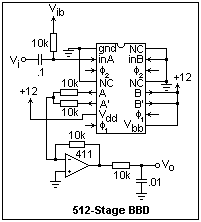 A circuit for testing one of the 512-stage BBD's is shown at the right. Note that all pins are connected somewhere. You will need a variable voltage source for Vib, the input bias voltage. I used a potentiometer buffered with a 411, but a simple potentiometer between 0 and +12 will probably do as well. This bias voltage is quite critical for the largest signal for which the ouput is undistorted. This largest signal is about 2V peak-to-peak, and required a bias voltage of 3.86 V for my chip. Adjust the bias voltage while looking at the output with an oscilloscope, trying to get the best output waveform that is not flat at the top or bottom. The gain of this circuit is quite close to +1, so the output looks just like the input. To show that the circuit is indeed creating a delay when using a sinusoidal signal, trigger the scope on the input and then vary the clock frequency. The ouput will be seen to move accordingly.