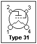 The 31 was designed for receivers using lead-acid cells as a power source. A vibrator and rectifier could be used for the B+ supply, while the filament was supplied directly from 2V DC. The oxide filament was very efficient, taking only 0.13A for a filament power of 260 mW. The type 30 medium-mu triode required only 0.06A, since the plate current requirement was less than for a type 31. This should be compared with the normal 6.3V at 0.3A, or 1.89W, for a heater-type cathode. The 31 was made in later days with the graceful ST12 envelope, but retained the typical small 4-pin base traditionally used for filament-type triodes. The type 30, with a similar envelope and base, was modernized as the 1H4-G and given an octal base. The type 31 never received this treatment, since it was already obsolete and used only for replacements.