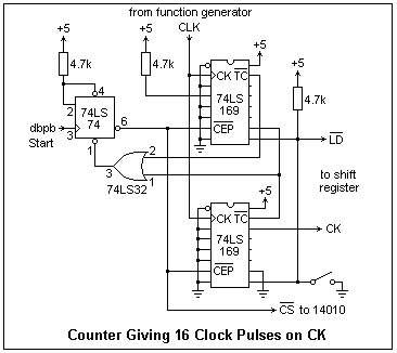 To complete our circuit for loading the DCP, we need a circuit that will produce exactly 16 clock pulses. A circuit that will do this is shown at the left. The principle is that the lowest-order bit of a binary counter counting down from 32 to 0 will make 16 clock pulses. The 74LS169 binary up-down synchronous counter is suited to this task. When pin 9 is pulled low, the data applied to the P inputs of the counter are loaded into the counter on the first positive edge of the clock signal CK. To count down, pin 1 is tied low. When the /CEP and /CET count enable pins (7 and 10, respectively) are held low, the counter decrements on the positive edge of the clock input CK. When the count reaches 0000, the terminal count pin /TC goes low. To cascade two counters as an 8-bit binary counter, the /TC of the low-order counter is connected to the /CET enable of the high-order counter. This makes the high-order counter decrement once every time the low-order counter reaches 0000. Clearly, any number of counters can be cascaded in this way.