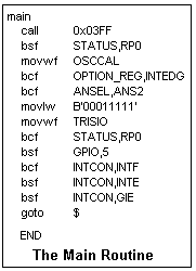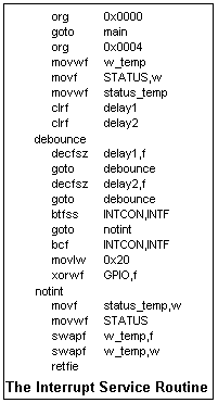 The complete program is shown in the figures. If the electronic debouncing circuit is used, the debouncing delay can be omitted. However, it is instructive to observe how a simple pushbutton behaves. If there are other interrupts enabled, the instructions to handle them follows the "notint" label. The instructions for saving and restoring W and STATUS are also shown, as is the oscillator calibration. These appear in the template file for the MCU.