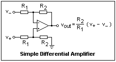 A differential amplifier can be constructed using an op-amp, as shown at the right. An op-amp is a differential amplifier itself, but its gain is far too high and frequency dependent to be used as such. The inverting and noninverting inputs are shown by v- and v+. The formula for the differential gain is easily obtained by considering the noninverting input grounded, which means the op-amp tries to keep both its inputs at zero, so the feedback on the inverting side is like a lever with lengths R1 and R2 (since the same current flows in both resistors, of course). The common-mode gain is easily seen to be zero, since the inputs go up together if the output voltage is zero. Of course, the actual common-mode gain will not be zero because of various small inequities, both in the resistors and in the op-amp. I tested such a circuit with a 411 op-amp, using R1 = 10k and R2 = 100k, for a differential gain of 10 (20 dB). Using 5% resistors, the common-mode gain was 0.029, and with 1% resistors, it was 0.019. The common-mode rejection ratio, CMRR, was, therefore, 10/0.019 = 526 or 54 dB.