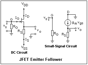 A JFET follower is shown in the diagram. Note that the supply voltages are now labeled VDD and VSS, and the nodes D, S and G rather than C, E and B. The leakage gate current is actually in the other direction from the arrow. The small-signal equivalent circuit of a JFET follower is much like that of a BJT follower, but even simpler since the base or gate current does not have to be considered at all. For signal purposes, the gate is an open circuit. The formula for the gain is the same, with RS replacing RE and rs ( = 1 / gm) replacing re. Since rs is larger than re, a few hundred ohms instead of a few tens or less, the gain is noticeably less than 1.0.