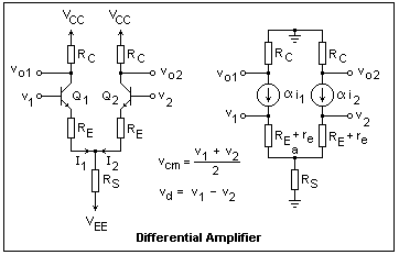 In the differential mode, the symmetry of the inputs means that node "a" will not change in voltage, and i1 = -i2 = vd/(2RE + 2re). From this result, the gain at an output node is easily found: G = RC/2RE + 2re). This is called the single-ended gain. If the output is taken between the two collectors (double-ended) the gain is twice this value. Note that we have inverting and noninverting outputs as well as inputs. The differential input simply divides the same total current between the two sides of the amplifier. It can go no farther than to put all the current through one collector or the other, however.