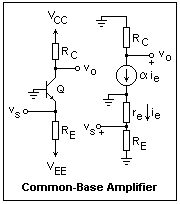A common-base amplifier is shown in the figure. A bipolar supply is used so that we can simply ground the base, without having to use the extraneous voltage divider that would be necessary with a unipolar supply. It's not a very mysterious circuit; the output is still taken from the collector, as usual. The input, however, is presented to the emitter. The resistor RE is required for bias purposes, and is not a feedback resistor as in most previous circuits. The small-signal emitter current is negative (this is just a change; the DC emitter current can't be negative, of course), and equal to vs/re. The alpha model is very convenient here. Now we can find the gain, which is G = RC/re. Note that the gain is positive, and can be large, because of the smallness of re. The input resistance is a bit less than re (actually re in parallel with RE, and so is quite small. A small resistor in series with the emitter will help to lower the gain and raise the input resistance. If you need a low input resistance to terminate a transmission line (say, 50Ω), a common-base amplifier is just what you want.