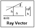A ray at an arbitrary position along the system axis is represented by a two-component column vector. The upper component is the angle with the system axis times the index of refraction of the medium in which the ray is travelling. The angle is positive if the ray rises in the direction of propagation, negative otherwise. The lower component is the height of the ray above the axis. The same ray will have different representations at different locations.