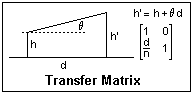 To refer a given ray to a different location, the transfer matrix is used. We have n'θ' = n θ and h' = h + θd, where d is defined as in the figure. The transfer matrix is then as shown. The reader may do the matrix multiplication to show that the result is as expected. The matrix precedes the vector, of course, to be conformable for multiplication.