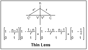 A thin lens consists of two spherical refracting surfaces of radii r1 and r2 with an medium of index n between them, when the distance d between the surfaces is neglected. We shall further assume that a medium of index 1 is on both sides of the lens. The results are easily extended to the case when the media may be different. The matrix representing the lens is just the product of the matrices for the two surfaces. It has the simple form shown. If we let the incident ray be [0 h], then the exit ray will be [a12h h], where a12 is the matrix element in the first row and second column. But by the definition of focal length f this ray should be [-h/f h], so a12 = -1/f. This f is actually the secondary focal length f', but for a lens in air f' = f, as is easily proved by turning the lens around and repeating the analysis. The general result is n/f = n"/f' if n and n" are the indices of the media on the left and right of the lens.