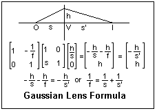 To find the image I of the object point O on the axis a distance s to the left of the lens, we start with a ray [h/s 0], transfer it a distance s to the lens, and refract it in the lens. A further transfer of some distance s' should give a ray [-h/s' 0]. After performing the matrix multiplications up to the second surface of the lens, we find [(-h/s - h/f) h], which should be [-h/s' h] if the ray is to cross the axis at s'. Equating corresponding elements, we have -h/s - h/f = -h/s', which can be rewritten as 1/s + 1/s' = 1/f, the Gaussian lens formula.