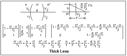 The sketch at upper right shows the significance of the forms of the 11- and 22-elements of the matrix, which we also found for two thin lenses in series. A ray incident horizontally and leaving the lens directed toward a focal point is shown, with its inclination and height at the second vertex V2 as given by the matrix. If the ray is projected backwards until its height is h (the height of the incident ray [0 h]), the point of intersection is on the principal plane, and gives the location on the axis of the second principal point H'. The focal length f' is the distance from H' to F'. Turning the problem around with a horizontal ray entering the lens at V2 will give us f and H. It is not very difficult to find expressions for all the distances that may be wanted by using the matrix.