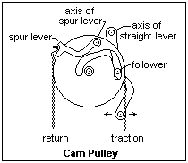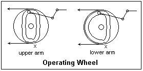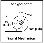 A typical signal mechanism consists of a cam, or operating, wheel with a groove that guides a small roller at the end of a lever. When the wheel rotates, the groove guides the pin towards the periphery of the wheel, which moves the signal arm off by a crank and up-and-down rod. The first and last parts of the rotation do not produce much motion. The cam slot is prolonged beyond the normal stroke and returns again to near the axis. We shall see that this is provided to ensure safety in case of a wire breakage. Two wire pulleys are generally used, around which the wire makes several turns. This ensures that if a wire breaks, the other wire can reliably rotate the wheel to the stop where the signal displays its most restrictive aspect. If the wire were simply passed over the wheel, it would fall off when either wire broke. A point mechanism (not shown) also has a wheel, but it contains a pin instead of a slot, which works in a slotted lever to move the switch-and-lock mechanism for the points. There are several popular mechanisms for moving and locking points. In Germany, a turnout must be capable of being run through from the heel direction without damage when not correctly set. This is often realized by locking only the point that is against a stock rail. Pressure on the other point transfers the lock to this point. Note that the cam wheel can rotate by different amounts, depending on the design. Most common are 180°, or 90° in opposite directions.