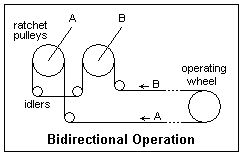 Two levers can also be used to pull a bifilar transmission in two directions. In the diagram, lever A pulls the bottom wire when it is reversed, and lever B pulles the upper wire. The wheels on the levers are loose on the axes and provided with ratchets so they will rotate freely in the reverse direction. This is a very common arrangement for operating and locking points. With both levers normal, the points are not locked and can be operated manually. When one lever or the other is reversed, the points are moved to the required position and locked. This method of using two 180° levers was by far the most common method of pulling the transmission in two directions. Often, two independent signals were controlled by the same pair of wires.