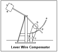 The duty of the wire compensator is to maintain a specified equal tension in the two wires independently of thermal expansion, and in case of wire breakage to ensure that the unbroken wire is pulled far enough to ensure that security arrangements work properly. The most widely used type, illustrated at the right, is the lever wire tensioner, with an adjustable weight "a" on one end of a lever usually inclined at about 45°, and a freely rotating pulley "b" carrying the signal wire near the other. The signal wire is guided by two fixed pulleys "c" to and from the movable pulley. There is one lever for each wire, which normally stand side by side. When the operating lever is moved, the tensions in the two wires become different. If there were no other arrangement, one lever would move upward and the other downward to equalize the tensions, and the wire pull would not be transmitted. To avoid this, a blocking device "d" carried at the end of the levers moves along a serrated rod. When the tensions in the two wires differ, the device rotates slightly to one side or the other and teeth contact the serrated rod "e", preventing the levers and the movable pulleys from moving up or down, so that the force is transmitted from the operating lever to the operated device. When the movement stops, the levers are again released.