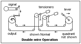 Around 1870 a method of operating turnouts by means of wires was developed in Prussia. The principle of this two-wire transmission is illustrated at the right. A wire passes around two pulleys, one at the operating lever, and the other at the output, that rotate together. It is shown operating a two-aspect upper quadrant semaphore, but of course this could just as well be a three-aspect signal, or a turnout, or anything else. The upper-quadrant semaphore arm provides its own restoring force, but it is not necessary here except in case of derangement. An essential element is the tensioning apparatus or Wire compensator (German, Spannwerk) that is seen beside the tracks when this method is used. How these devices function will be described in detail below. The tensioning apparatus compensates for thermal expansion. Solid wire is generally used because of its resistance to corrosion; great care must be taken not to nick it. Wire rope or chains is used to go around pulleys.