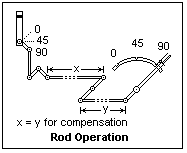 When it became necessary to work points, facing-point locks, and similar devices remotely from a central location, a new method had to be devised, since it was unsatisfactory to work against a counterweight in these applications. Not only a tension, but a compression as well had to be transmitted. The wire was replaced by a rod, initially the easily available 1" gas pipe with its screwed fittings. A straight lever could change the stress from tension to compression, and bent levers could change the direction of the rod. The fact that both tension and compression were available made temperature compensation easy. It was only necessary to reverse the stress at one or more points, and to ensure that the total distance in compression was equal to the total distance in tension. The operation of a three-aspect upper quadrant signal is illustrated. It would be possible, but not convenient, to operate such a signal by two wires working against counterweights, but this was never done.