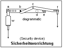 The very simple security device for 2-aspect signals is shown at the right. It consists of two levers, each pivoted in the part to be moved (at points c and e) and held together at pin b. In equilibrium, the wires exert equal torques about the axis d. If the wire at f breaks, the upper lever immediately rotates and slips out of contact with the pin b. The lower lever, no longer supported, swings down with the help of weight w and now acts on the other side of the axis d, pulling the semaphore arm horizontal. In normal operation, this weight also helps to counterbalance the weight of the arm, making it easier to raise. Should the other wire break, there is no immediate danger, but the levers also fall apart and the final result is the same.