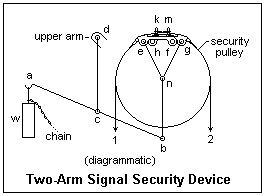 It is now easy to understand how the security device for the two-arm Austrian semaphore works. In the figure, note that the wires 1 and 2 tend to rotate the security pulley in opposite directions, that they overlap, and are fastened at two studs k and m on levers pivoted at h and f. Where wires pass around pulleys, as in this case, they are generally replaced by chains to avoid repetitive bending of the wires. The chains pass over the free ends of the levers at e and g, holding them down. The weight w, on the other hand, acts to push these ends upwards, acting through a chain of members acbneg. Weight w actually performs three functions. Since fulcrum c is suspended from the tail of the upper arm, w acts to counterbalance the weight of this arm, as in the one-arm semaphore. Should one or the other wire break, one or the other of the levers ef or gh can move, shedding the other wire from its stud. This means that if one wire breaks, the other is also disconnected from the security pulley. Finally, if this should happen, point a sinks enough that weight w falls off the end of it. Now w hangs on a chain that passes around a small pulley (not shown) and pulls the upper arm horizontal. This will also pull the lower arm vertical, due to the connection between the arms. Therefore, if either wire breaks, the signal returns to its normal aspect of Halt.
