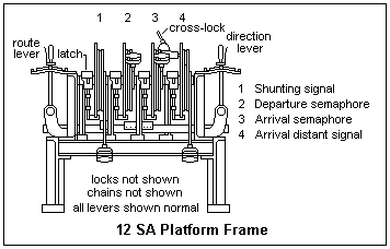 A common arrangement had the Siemens and Halske block instruments in a row of four in an upper housing, with the signal handles at each side of a box containing the interlocking apparatus, which was directly dependent on the block instruments above. The two signals were the starting signals for each direction at the block post concerned.