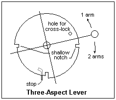 Each lever is attached to a grooved pulley that carries a chain attached to the operating wires. The three-aspect levers can be pushed in so they do not protrude inconveniently in the normal position. The latch is very different from that illustrated above. On the left of the lever wheel is attached a disc with latch notches. The latch is held in by a weight to the left of each lever. When this weight is lifted, by means of a convenient projection, the latch is moved downward, and the lever can be moved, the latch piece riding on the periphery of the disc. The disc for a three-aspect lever is shown at the right in the normal position. If the latch is lowered a certain distance, the lever can be moved upwards to display the Frei aspect. However, since the latch is not fully raised, the lever cannot be moved downward to display Frei mit 40 km/h. When the latch is fully lowered, the lever could be moved in either direction, but a stop (as shown) prevents the upward movement when it strikes a locking piece, so only Frei mit 40 km/h can be displayed.
