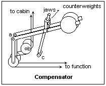 There are four essential parts to the system: the levers, the compensators, and the signal and point operating mechanisms. Two wires are used for each function controlled by a lever in the signal cabin. The wires are constantly under considerable tension that is normally equal in the two wires. That is, they are never slack, and this facilitates operation. It is not true that one wire was slack, as some references assert. When a lever is moved, the tension in one wire is made greater than in the other, and the force is transmitted to a wheel at the function, which rotates to carry out the function, after which the tensions in the two wires are again equal. The wire compensator is the mechanism that maintains the tension by means of a heavy counterweight for each wire of the pair. One compensator design is shown in the Figure. The pivots at points marked a, b and c are fixed in the frame of the compensator. When the temperature changes, the two counterweight levers move together to keep the wires taut. In hot weather, the counterweights sink; in cold weather they rise. If the tension in one wire is made greater than in the other, by moving a lever, one counterweight tends to move relative to the other. This relative motion is stopped by the jaws or blocking device, which is rotated slightly by any relative motion so that their teeth engage the serrated rod, which holds the counterweights fixed as long as the tension is different.
